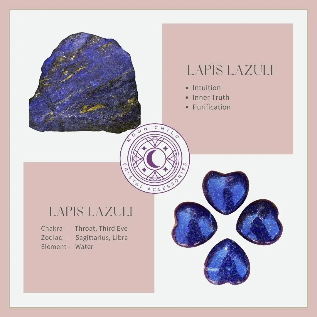 Lapis Lazuli is a semi-precious stone with a deep blue color and various minerals. It has physical and metaphysical properties that are beneficial for the throat, thyroid, endocrine, respiratory, and nervous systems. It also helps with hearing loss, insomnia, depression, and vertigo. Lapis Lazuli is a stone of protection, serenity, and peace that can negate harmful energies, calm tempers, and release stress It stimulates the mind, bringing objectivity, clarity, creativity, wisdom, and leadership qualities