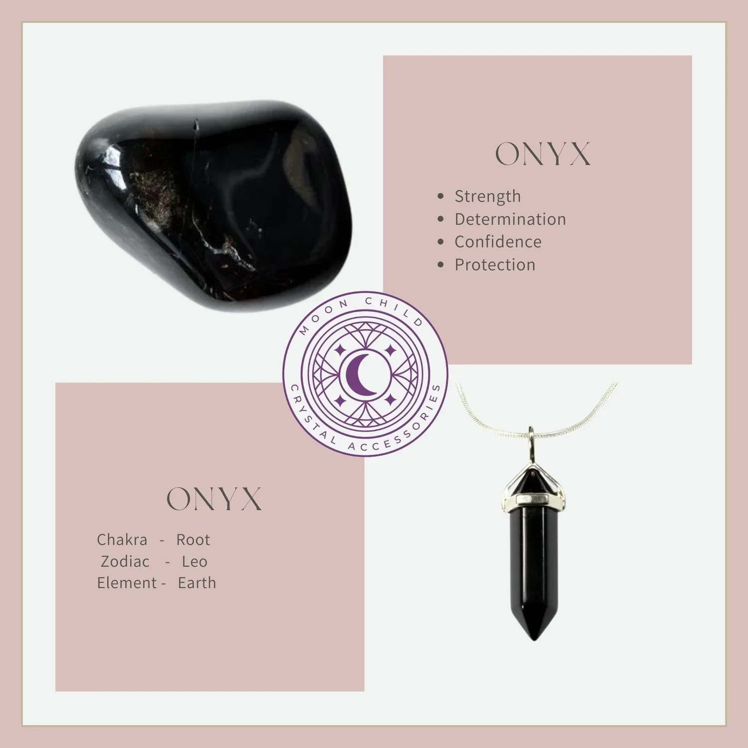Onyx gives strength. It promotes vigour, steadfastness and stamina. Imparts selfconfidence, helping you to be at ease in your surroundings. Onyx banishes grief, enhances self-control and stimulates the power of wise decision-making. It encourages happiness and good fortune.